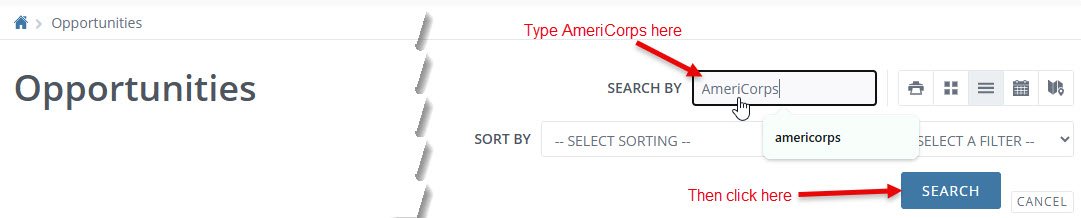 You can also find AmeriCorps service opportunities here on ServeMaine . Type 'AmeriCorps' into the SEARCH BY field on the Opportunities page